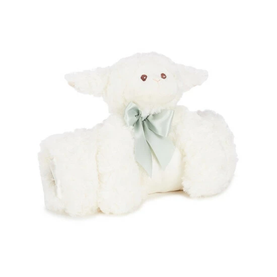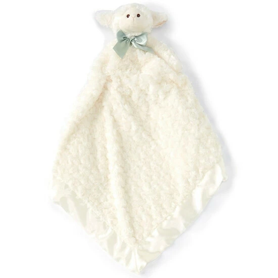- Lamb plush with a satin bow detail around the neck