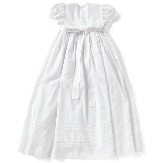 - heirloom christening gown with hand embroidery and pintucking on bodice and skirt