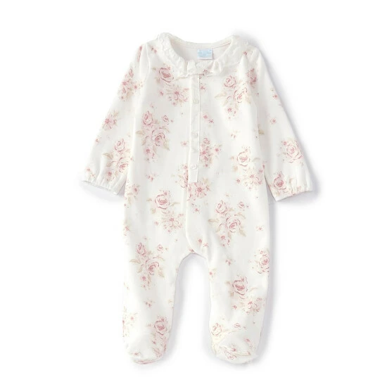- Floral-printed knit footed coverall with woven ruffle and delicate ivory lace detail around the neck
