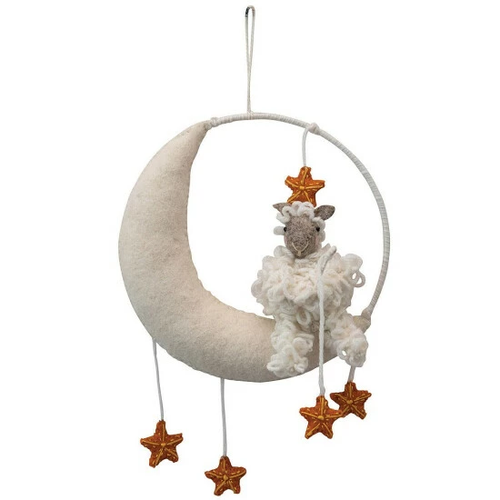 - Mobile or wall décor features handcrafted wool moon and stars with sheep in soft cream and golden hues